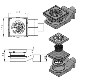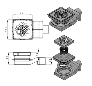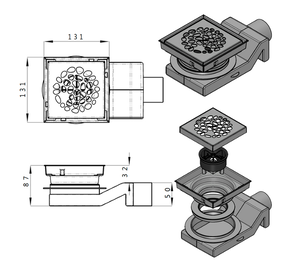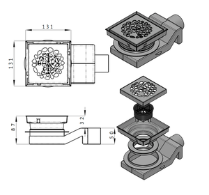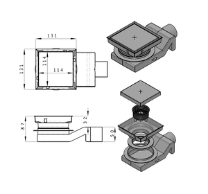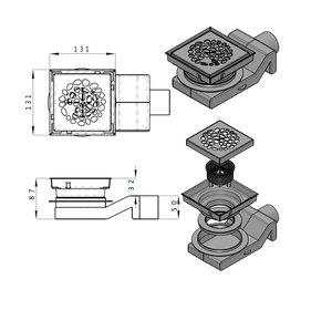 PSH13MT Трап душевой PS HOLDER 13x13 2устор. накладка из нерж.стали, комбинир.затвор с горизонт. Вып