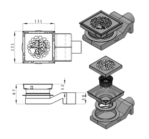 PSS13OR Трап душевой PS STONES 13x13 2устор. решетка из нерж.стали, комбинир.затвор с горизонт. Выпу